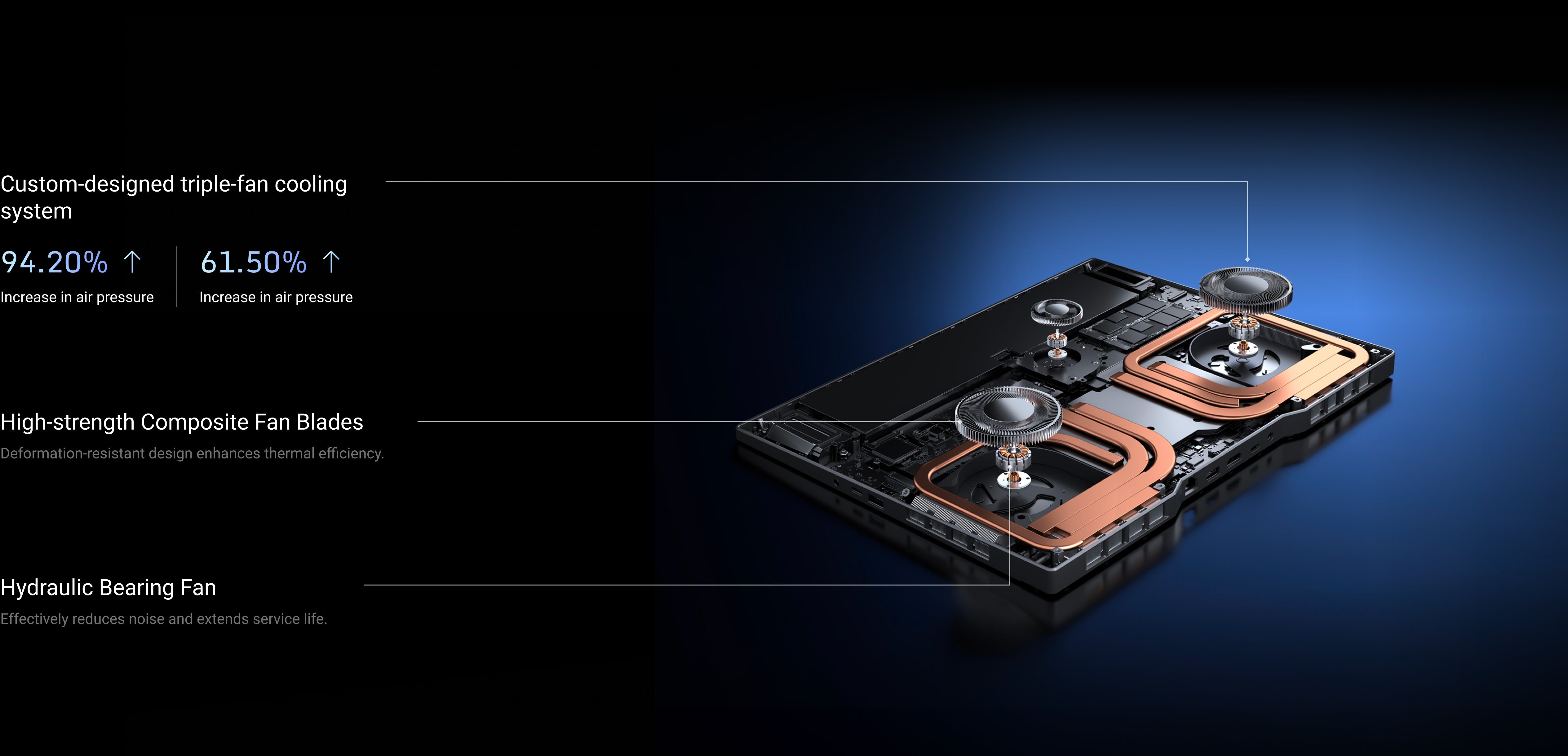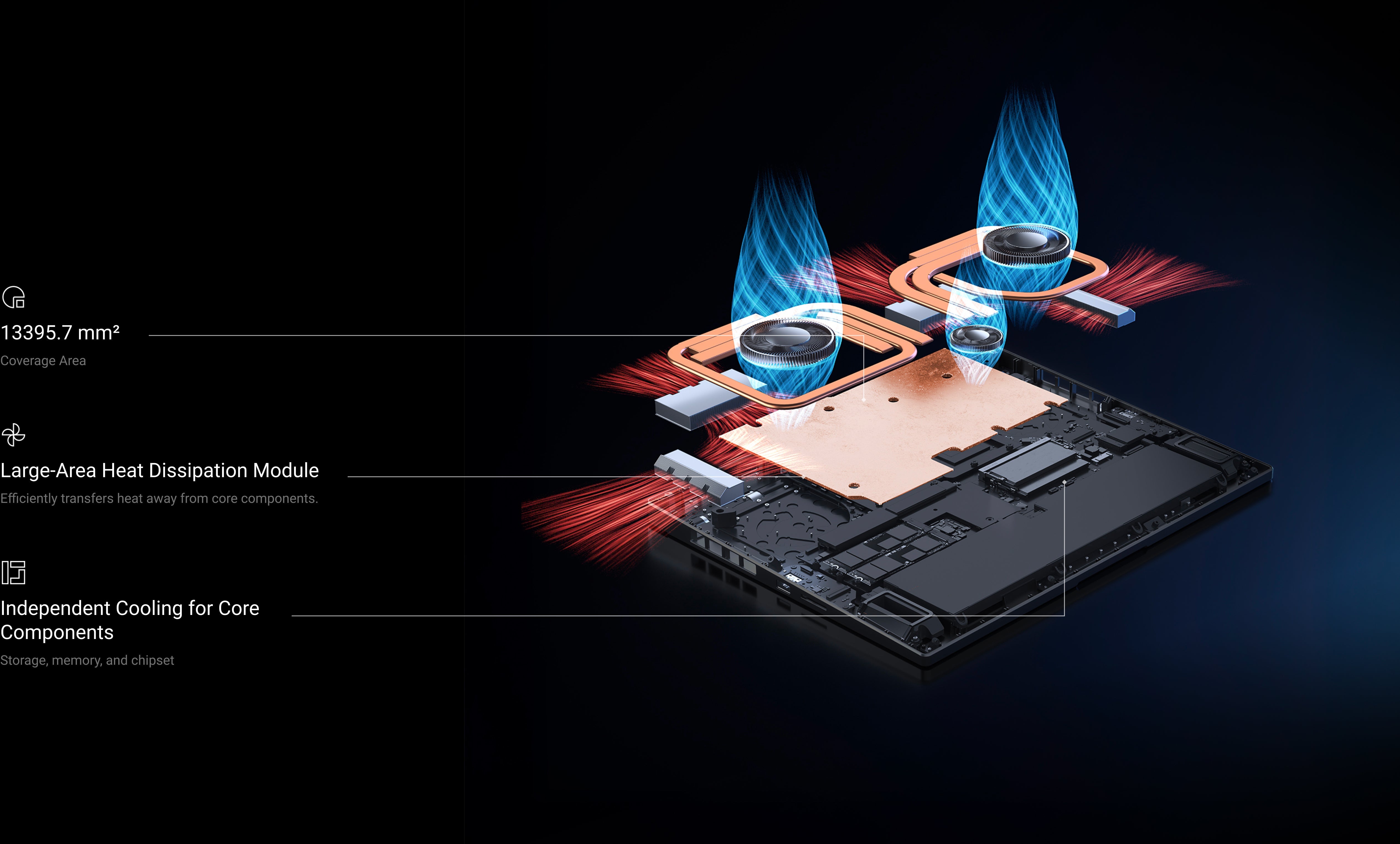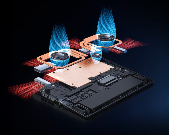 3D airflow design enables large volumes of cool air to flow into the chassis. 6 heat pipes combined with an extra-large vapor chamber rapidly cool key components and the entire system, with built-in fans and pass-through exhaust for faster heat dissipation.